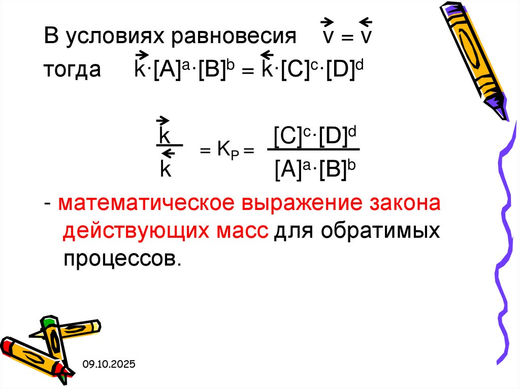 В условиях равновесия v = vтогда k·[A]a·[B]b = k·[C]c·[D]d