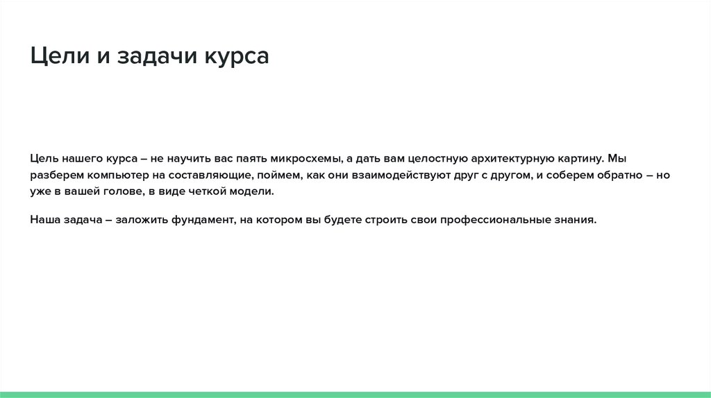 Цели и задачи курсаЦель нашего курса – не научить вас паять микросхемы, а дать вам целостную архитектурную картину. Мы