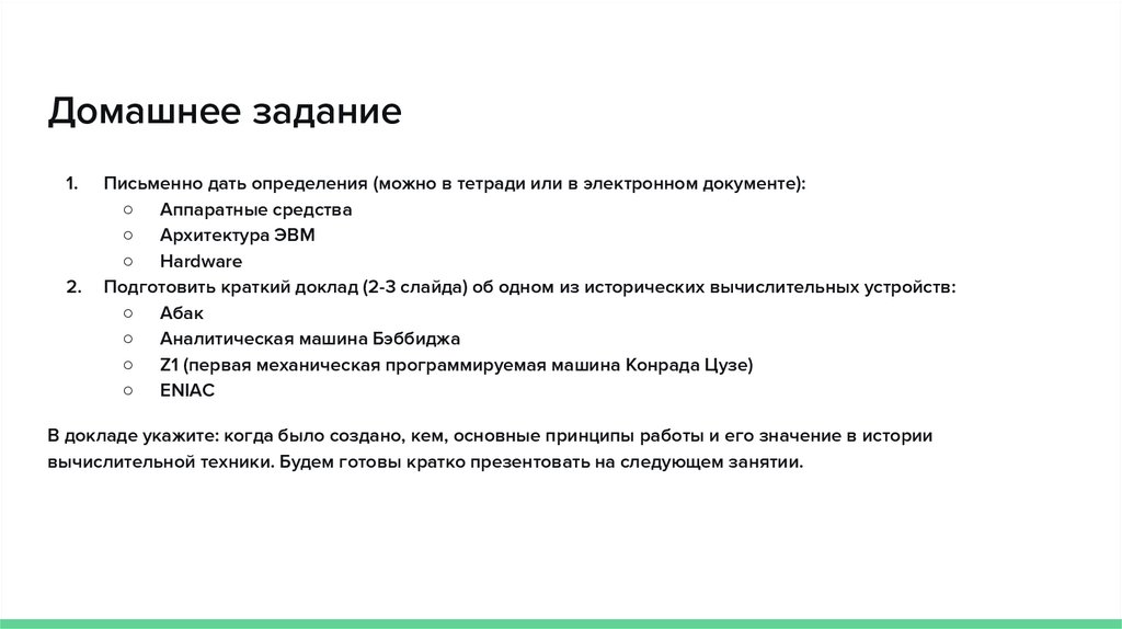 вычислительной техники. Будем готовы кратко презентовать на следующем занятии.