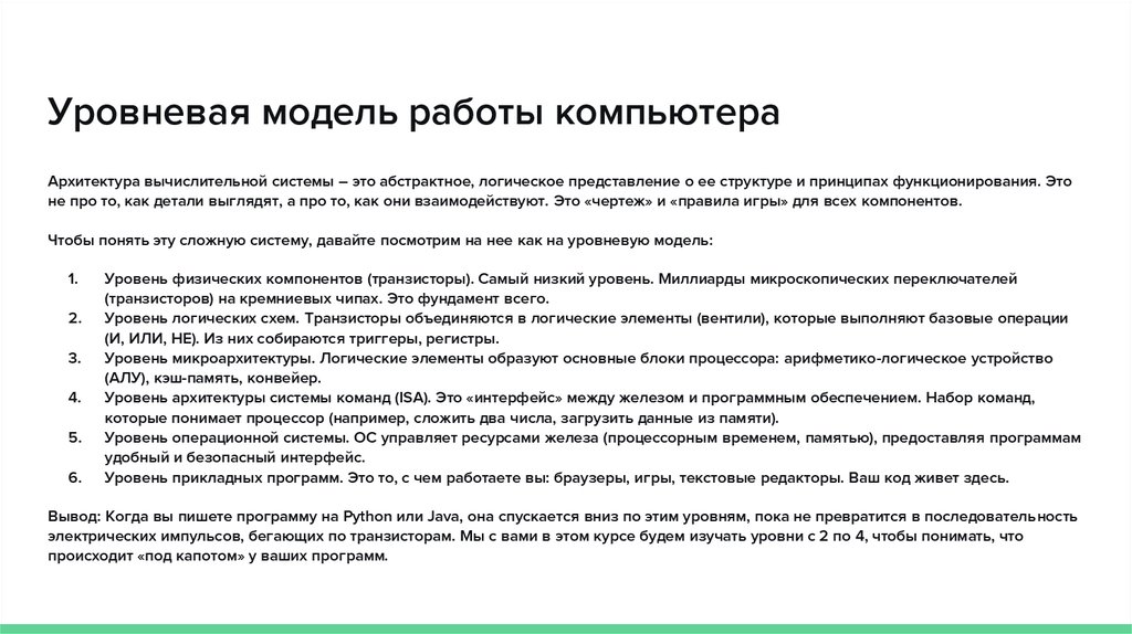 Вывод: Когда вы пишете программу на Python или Java, она спускается вниз по этим уровням, пока не превратится в последовательность