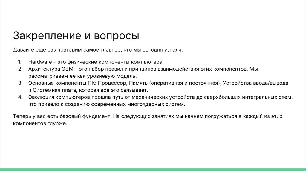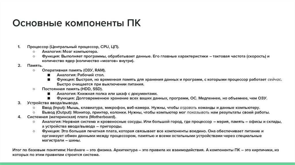 Итог по базовым понятиям: Hardware – это физика. Архитектура – это правила их взаимодействия. А компоненты ПК – это кирпичики, из