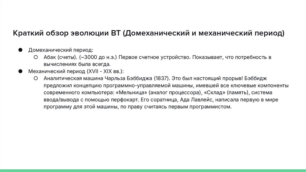 Краткий обзор эволюции ВТ (Домеханический и механический период)Домеханический период: