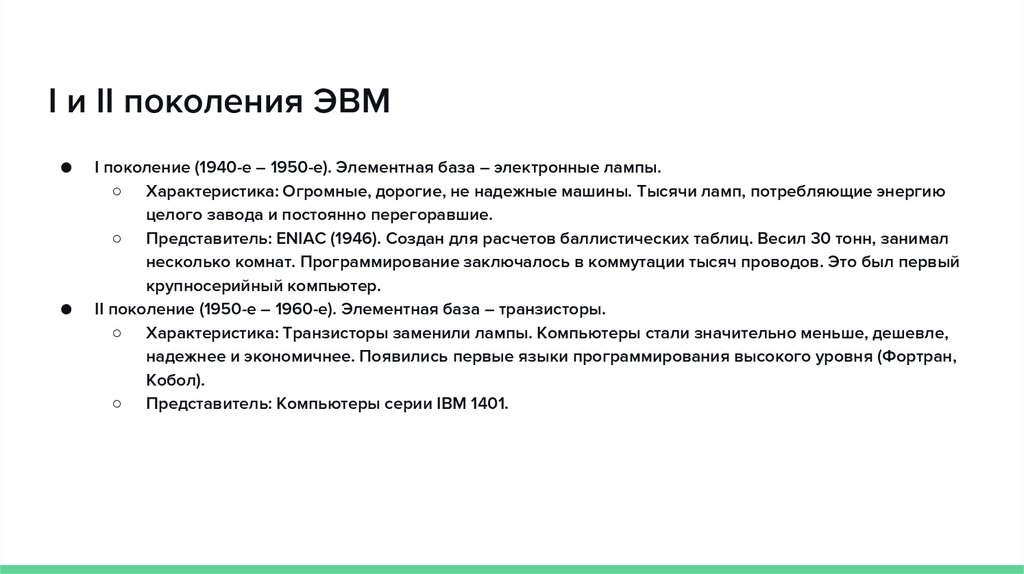 I и II поколения ЭВМI поколение (1940-е – 1950-е). Элементная база – электронные лампы.
