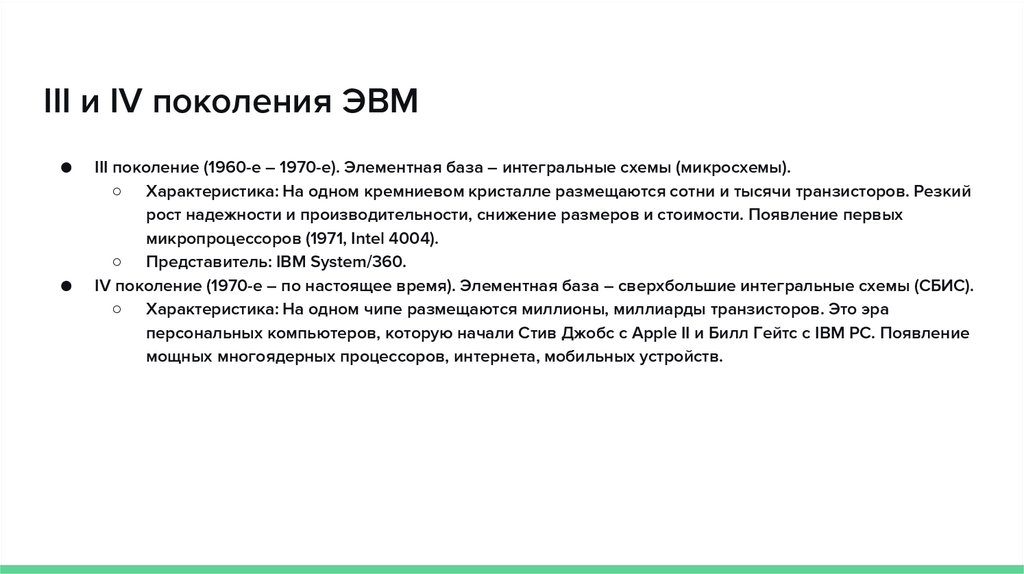 III и IV поколения ЭВМIII поколение (1960-е – 1970-е). Элементная база – интегральные схемы (микросхемы).