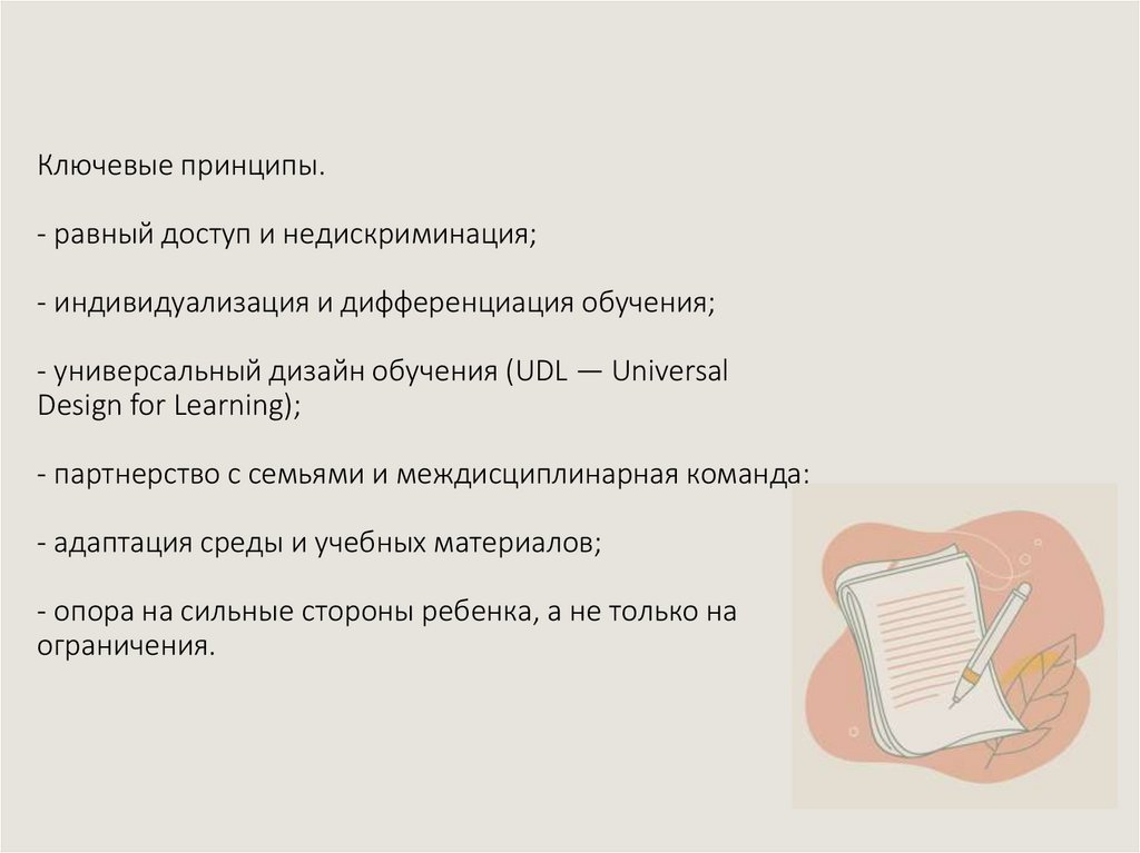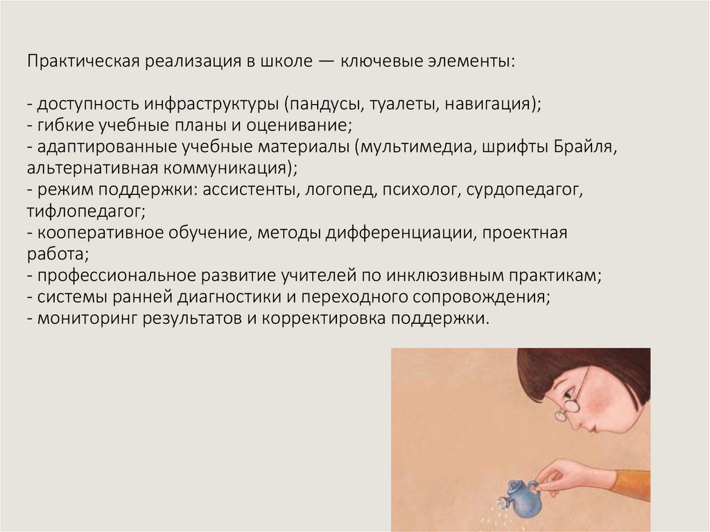 Практическая реализация в школе — ключевые элементы:- доступность инфраструктуры (пандусы, туалеты, навигация);