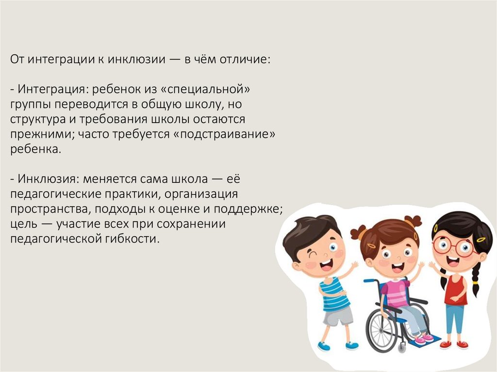 От интеграции к инклюзии — в чём отличие:- Интеграция: ребенок из «специальной»
