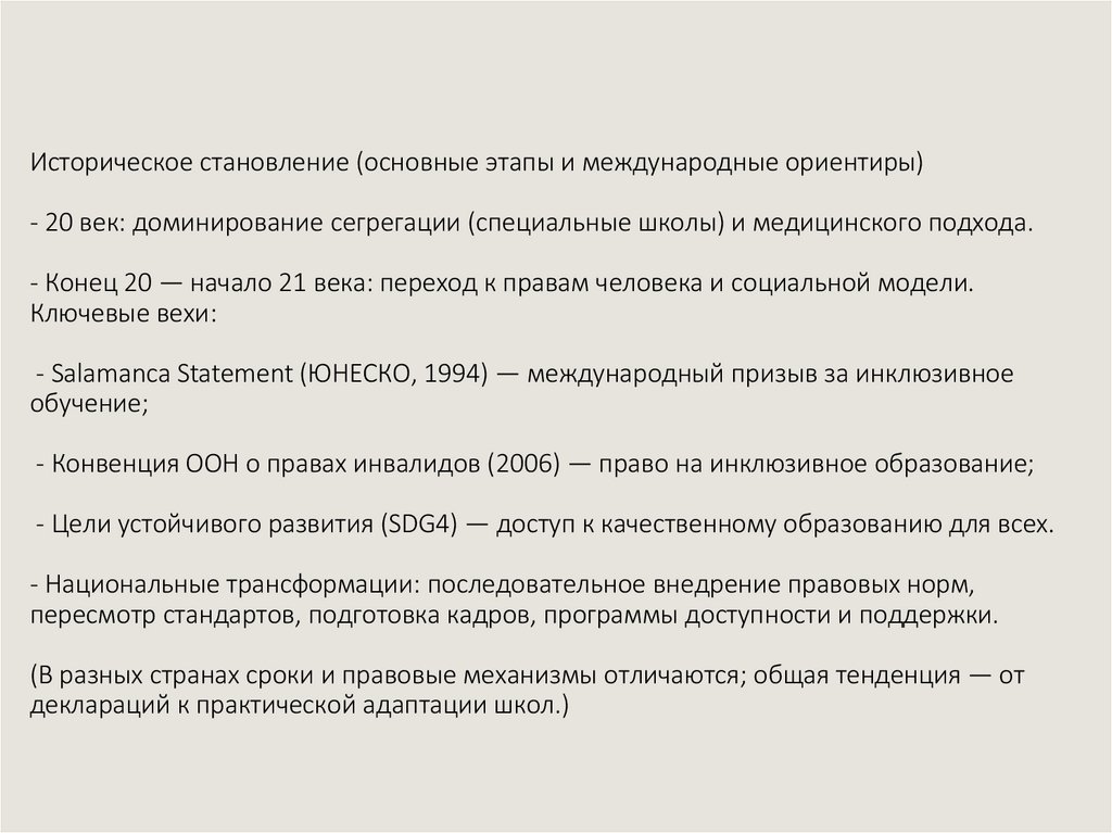 Историческое становление (основные этапы и международные ориентиры)- 20 век: доминирование сегрегации (специальные школы) и медицинского подхода.