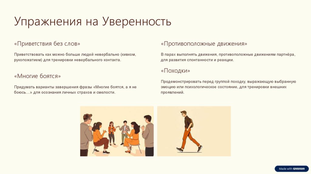 Тренировать мимику, жесты, походку, отражающие уверенность.