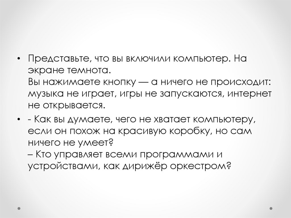 • Представьте, что вы включили компьютер. Наэкране темнота.
