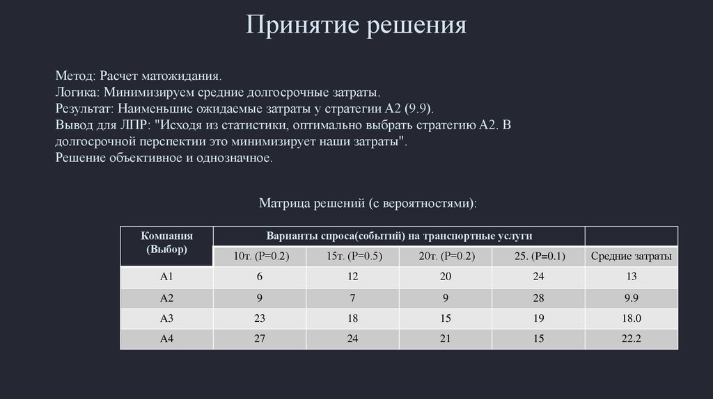 Вывод для ЛПР: "Исходя из статистики, оптимально выбрать стратегию A2. В
