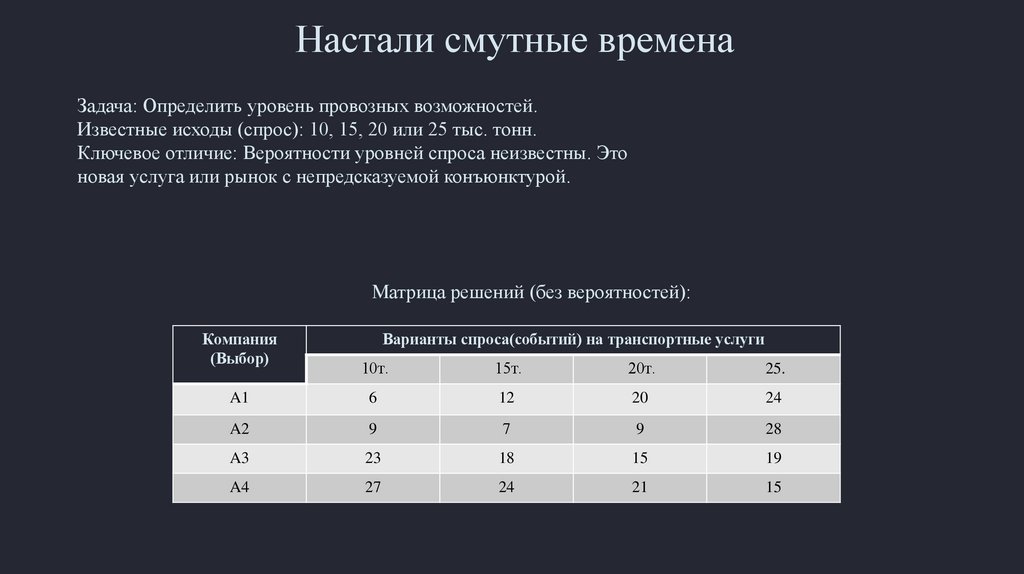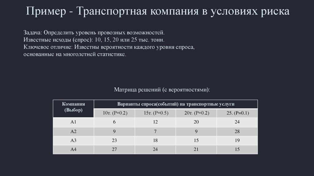 Пример - Транспортная компания в условиях рискаЗадача: Определить уровень провозных возможностей.