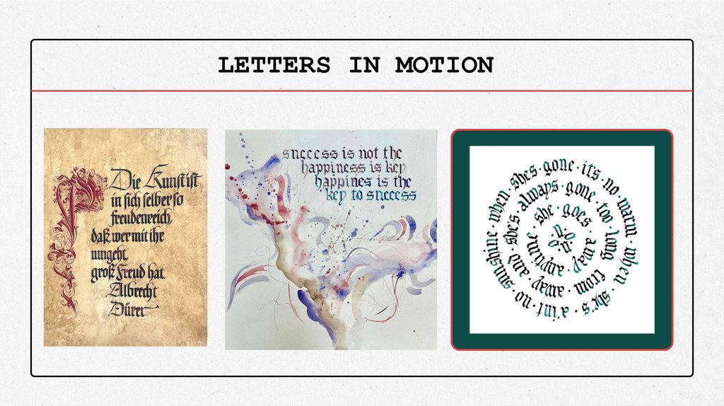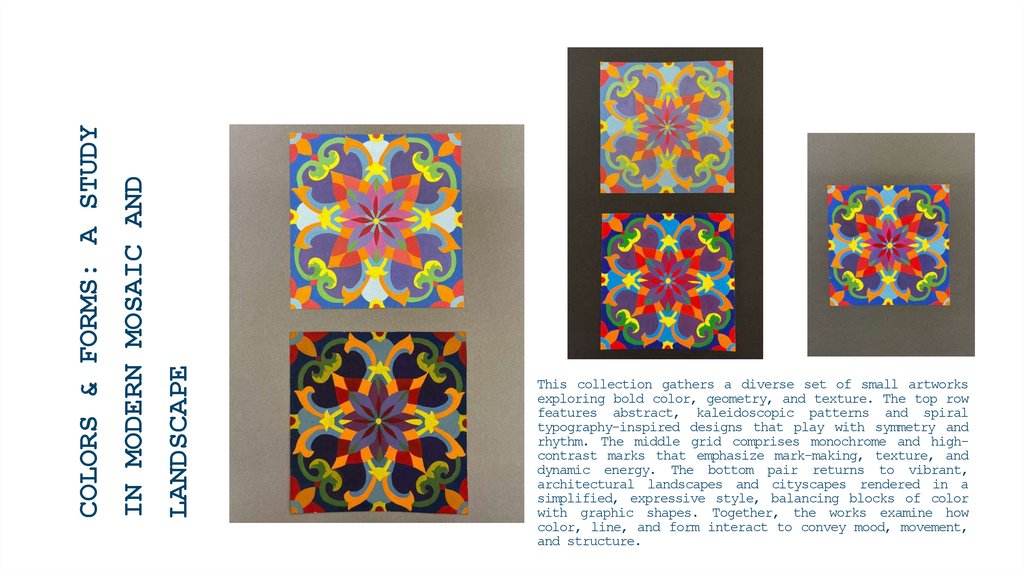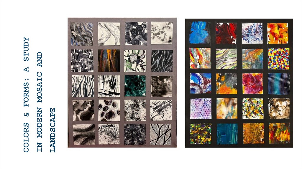 rhythm. The middle grid comprises monochrome and highcontrast marks that emphasize mark-making, texture, and