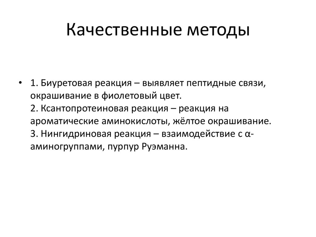 Качественные методы• 1. Биуретовая реакция – выявляет пептидные связи,