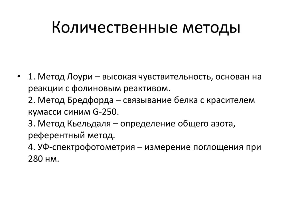 Количественные методы• 1. Метод Лоури – высокая чувствительность, основан на