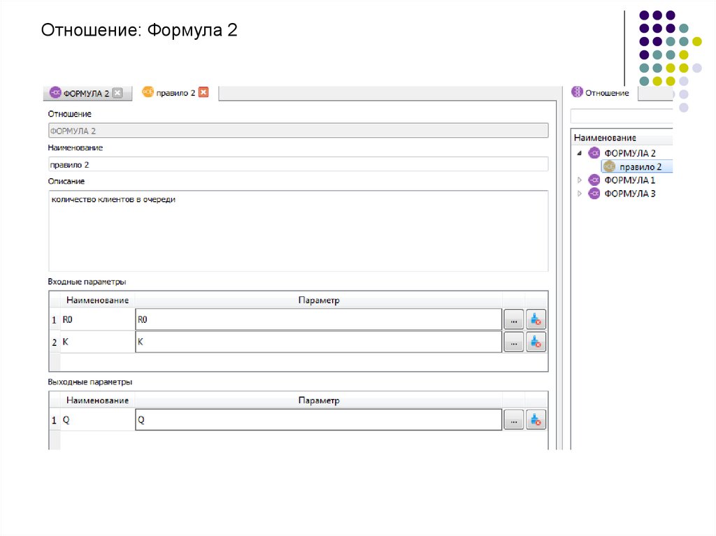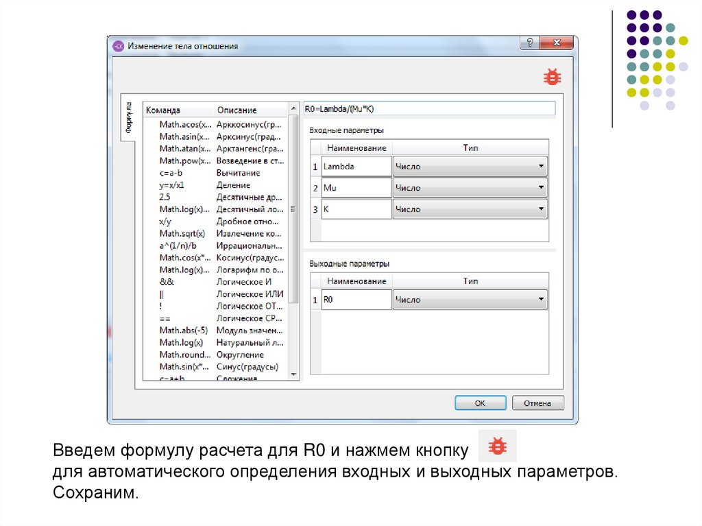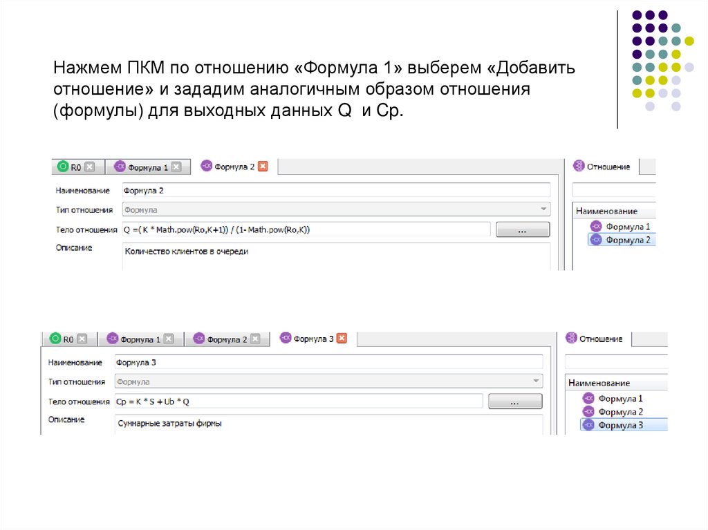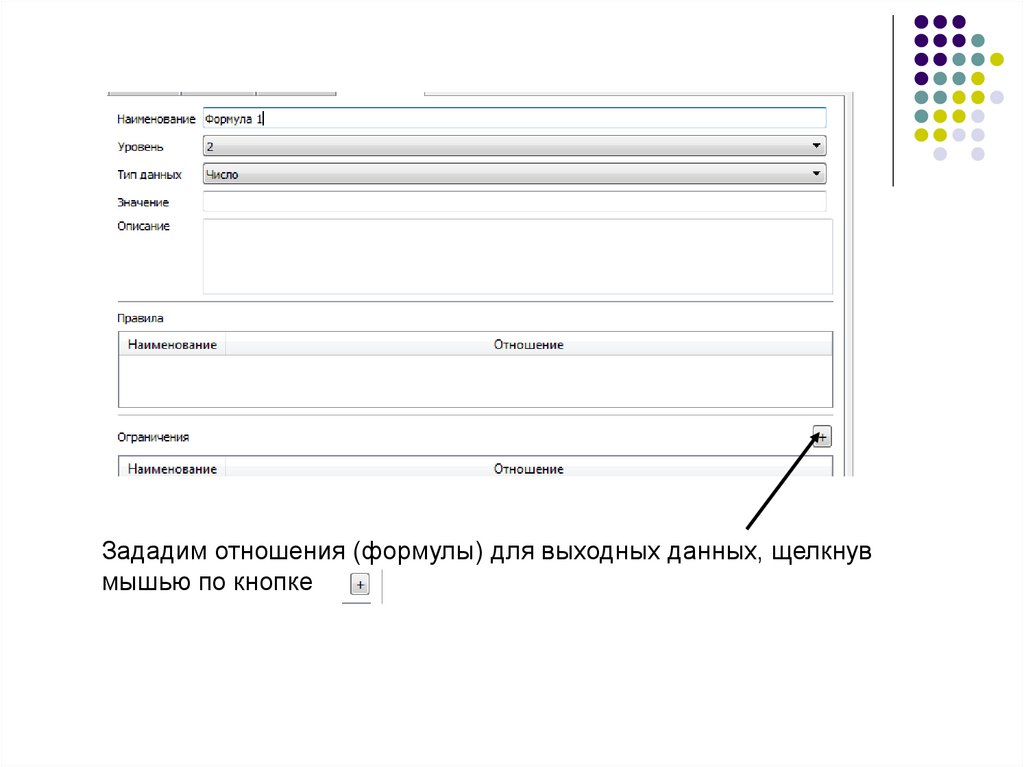 Зададим отношения (формулы) для выходных данных, щелкнувмышью по кнопке