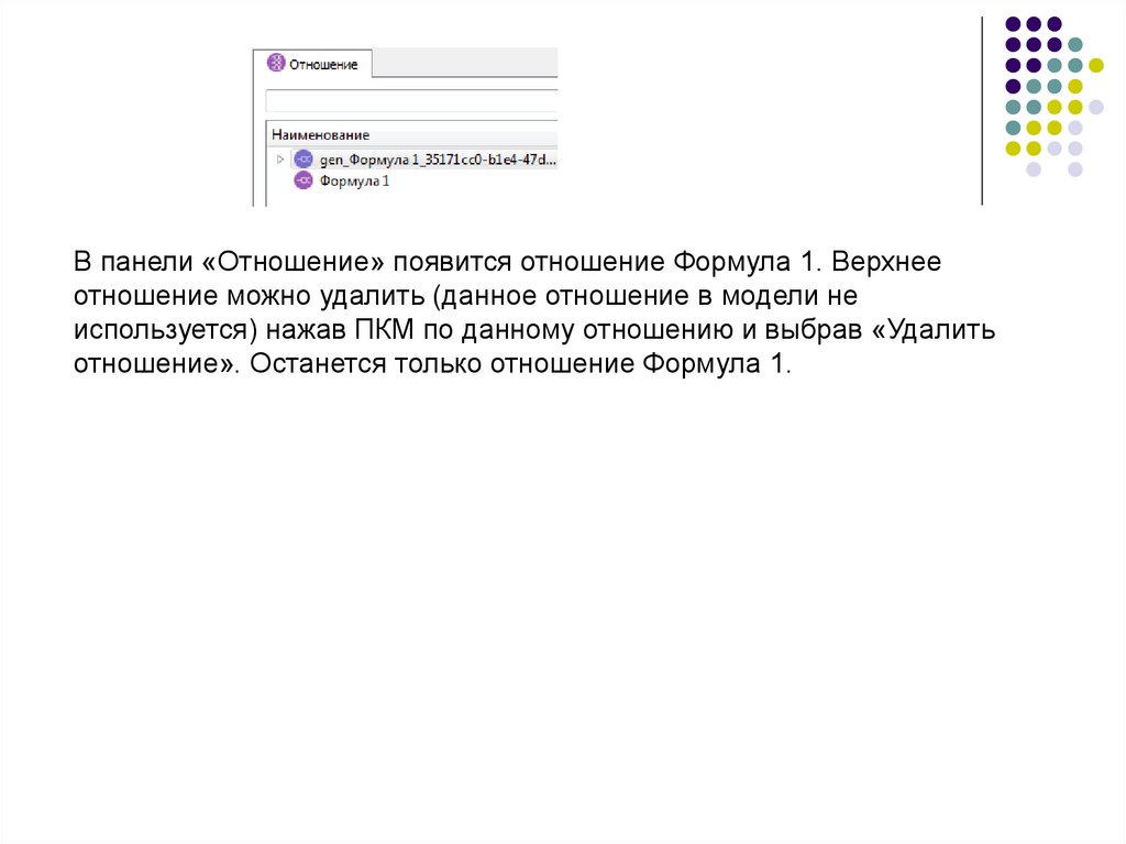 В панели «Отношение» появится отношение Формула 1. Верхнееотношение можно удалить (данное отношение в модели не