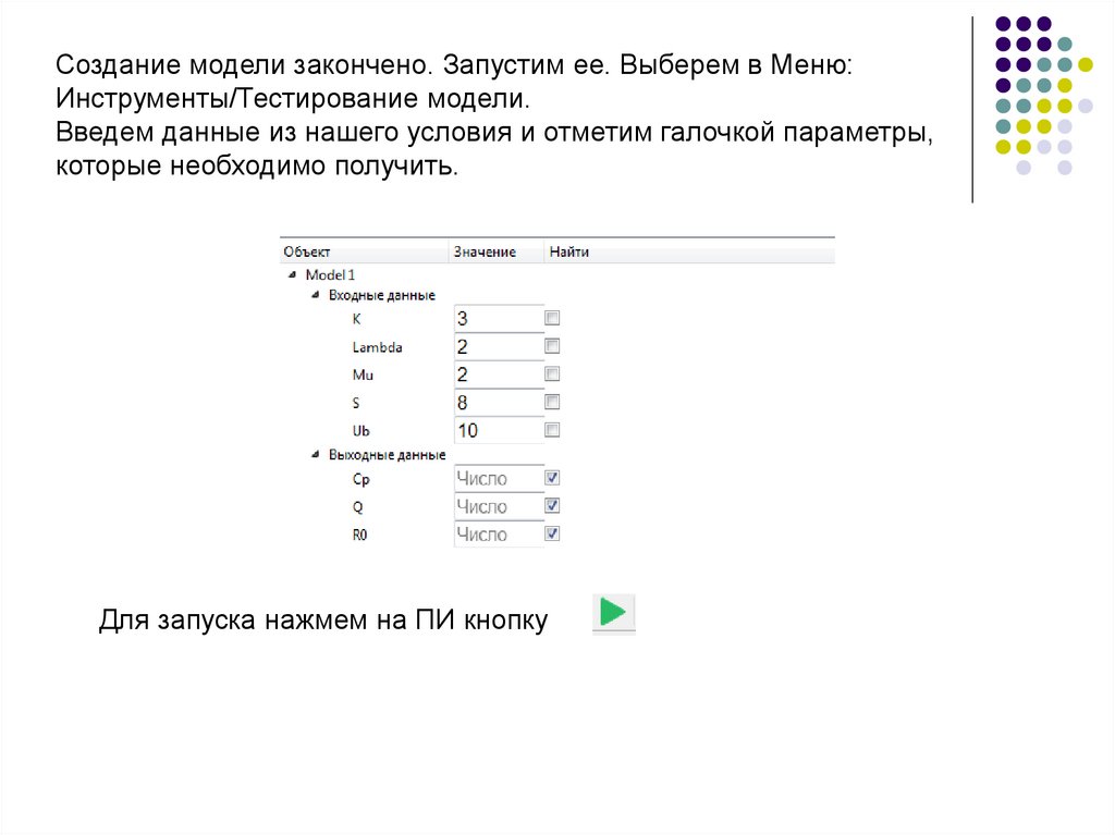 Создание модели закончено. Запустим ее. Выберем в Меню:Инструменты/Тестирование модели.
