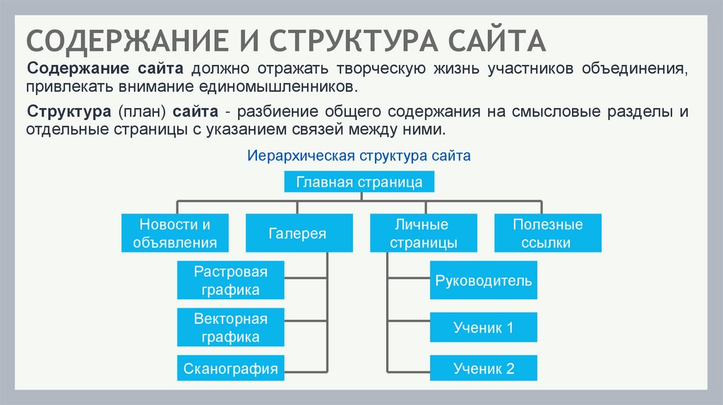Структура (план) сайта — разбиение общего содержания на смысловые разделы и отдельные