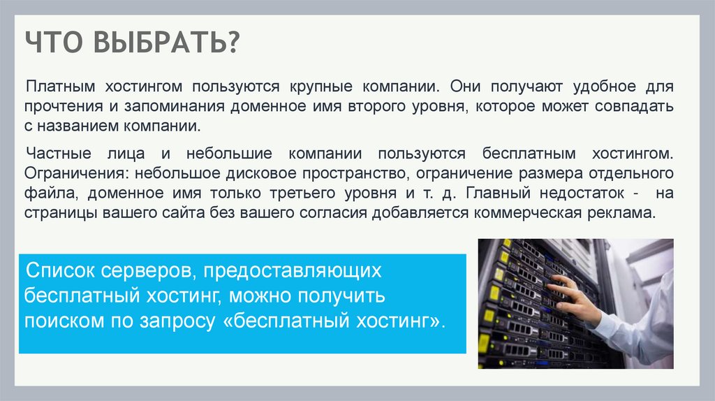 ЧТО ВЫБРАТЬ?Платным хостингом пользуются крупные компании. Они получают удобное для