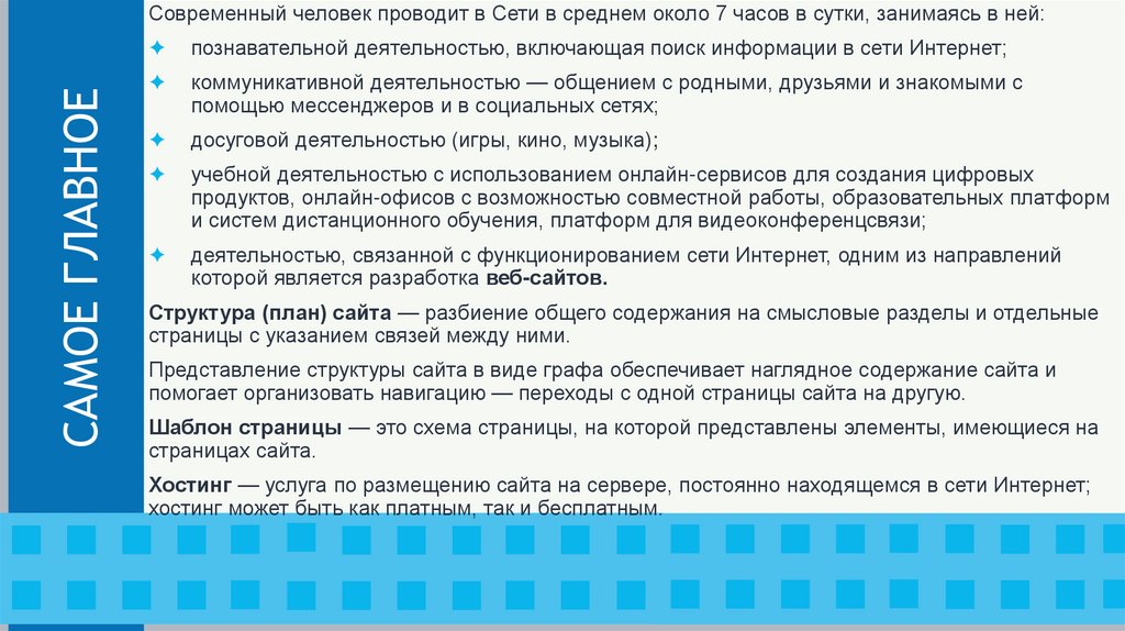 САМОЕ ГЛАВНОЕСовременный человек проводит в Сети в среднем около 7 часов в сутки, занимаясь в ней: