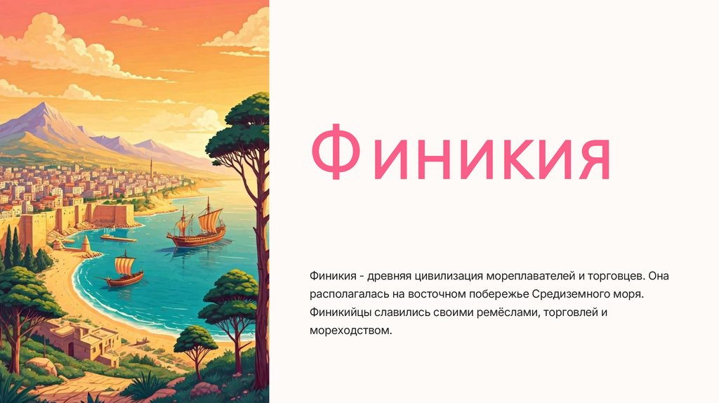 Ф иникияФиникия - древняя цивилизация мореплавателей и торговцев. Она