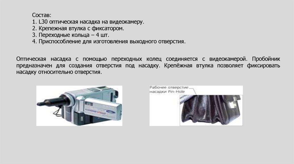 Состав:1. L30 оптическая насадка на видеокамеру.