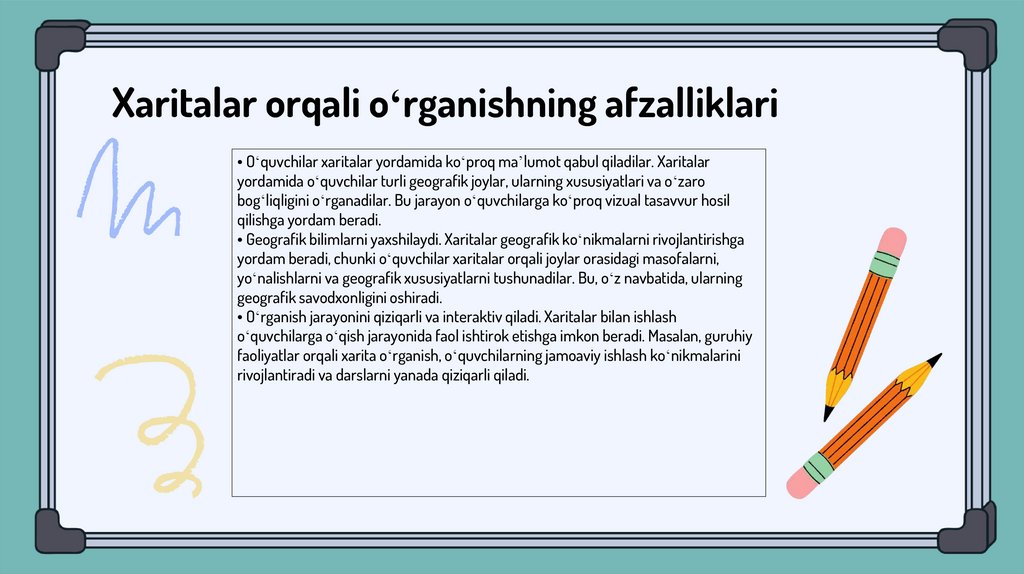 • O‘rganish jarayonini qiziqarli va interaktiv qiladi. Xaritalar bilan ishlash
