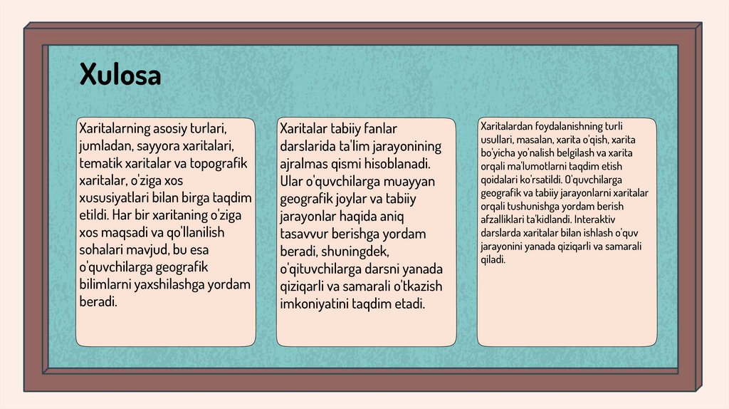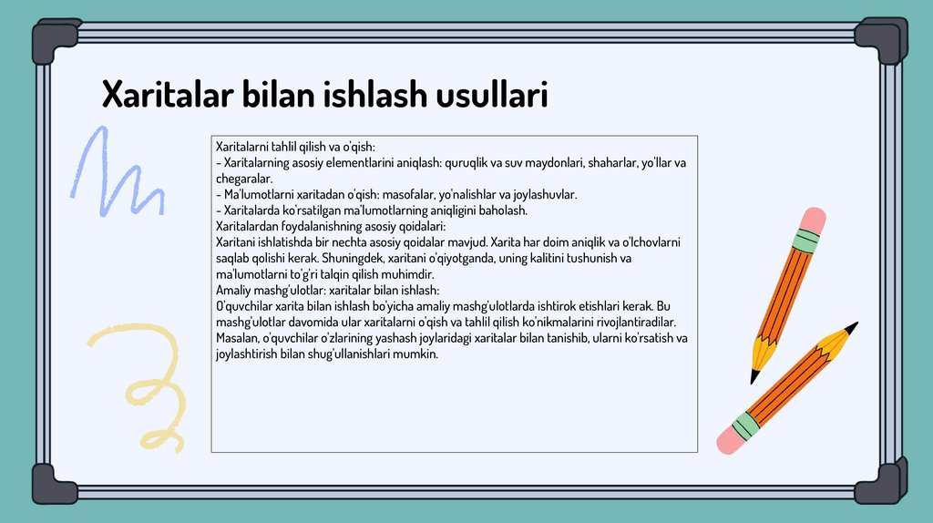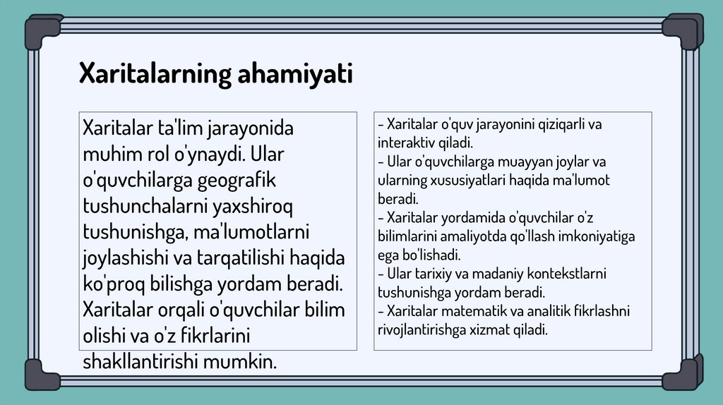 • Geografik bilimlarni yaxshilaydi. Xaritalar geografik ko‘nikmalarni rivojlantirishga