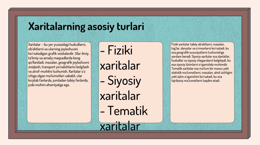 Tematik xaritalar esa ma'lum bir mavzu yoki