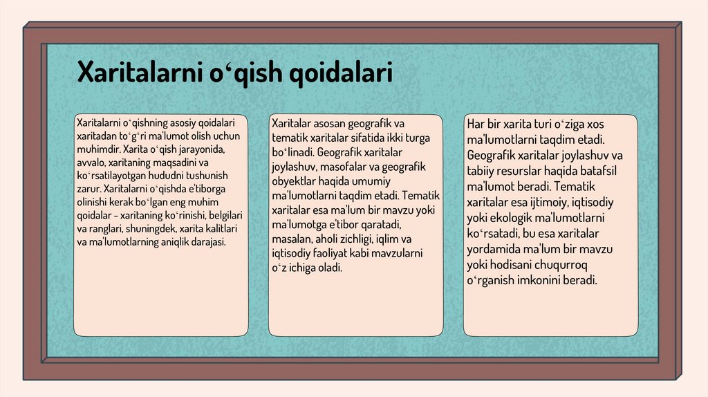 Xaritalarni o‘qish qoidalariXaritalarni o‘qishning asosiy qoidalari