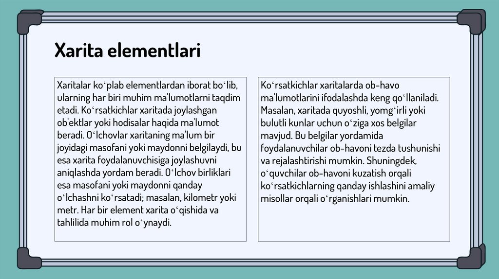 - Xaritalarning asosiy elementlarini aniqlash: quruqlik va suv maydonlari, shaharlar, yo'llar va