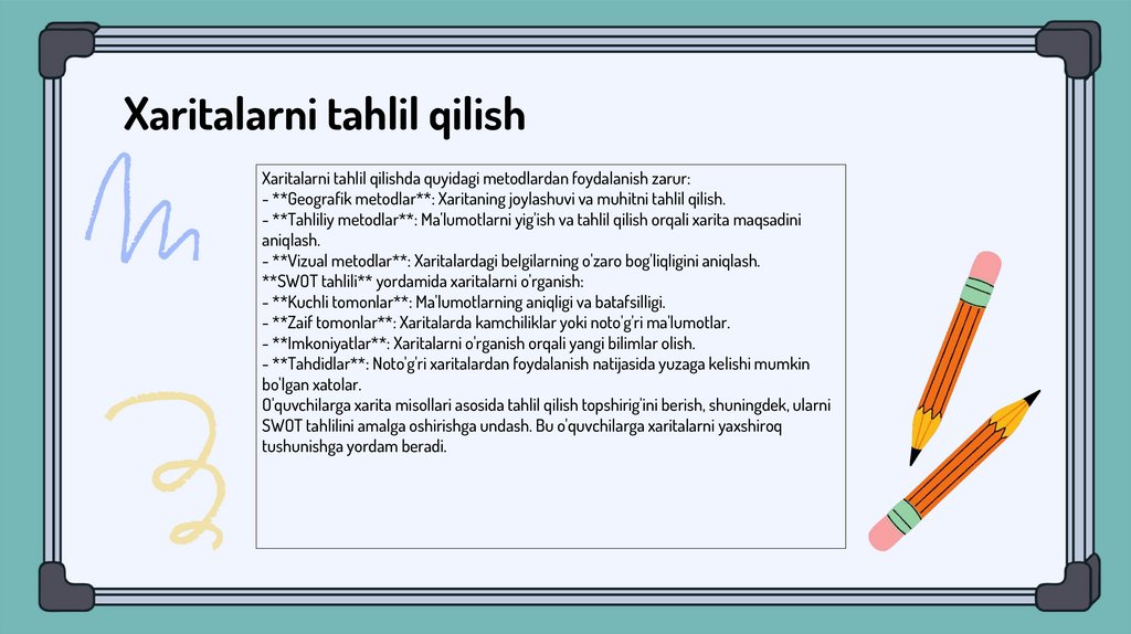 SWOT tahlilini amalga oshirishga undash. Bu o'quvchilarga xaritalarni yaxshiroq