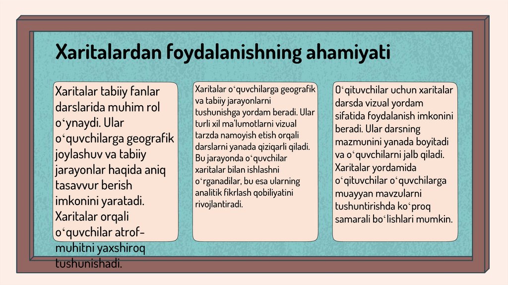 Xaritalarning ahamiyatiXaritalar ta'lim jarayonida