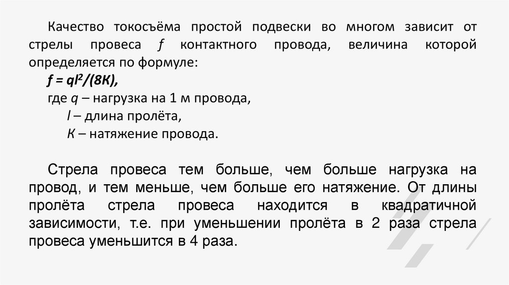 Качество токосъёма простой подвески во многом зависит отстрелы провеса f контактного провода, величина которой