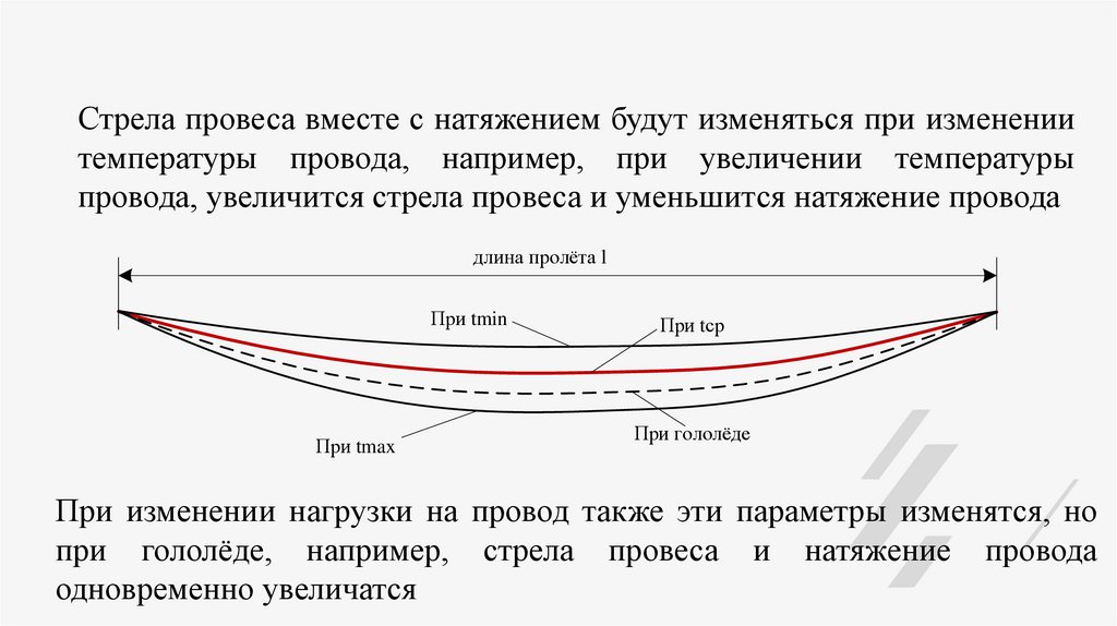Стрела провеса вместе с натяжением будут изменяться при изменениитемпературы провода, например, при увеличении температуры