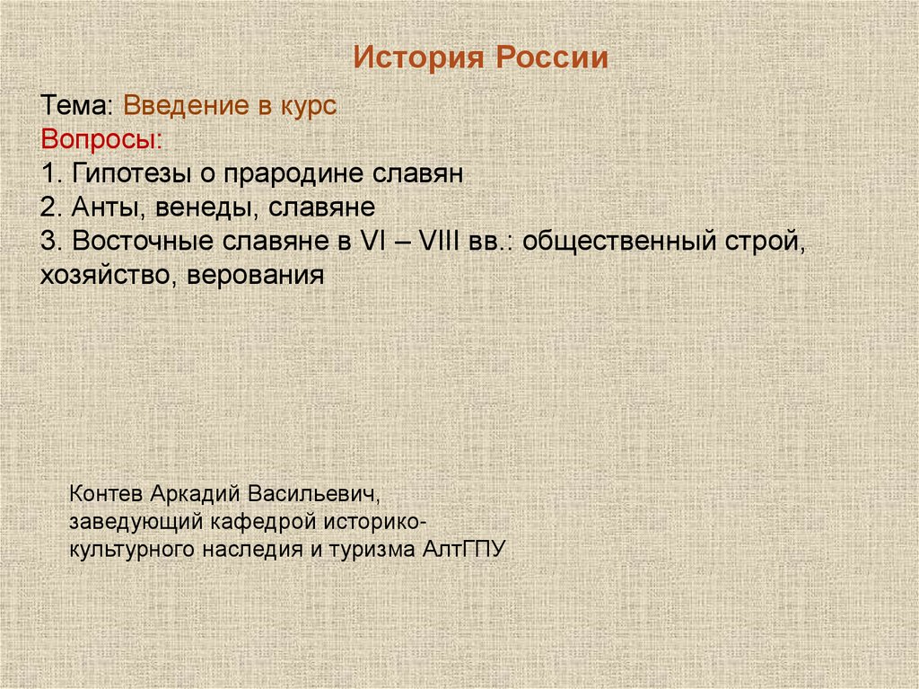 1. Тема: Введение в курс Вопросы: 1. Гипотезы о прародине славян 2. Анты, венеды, славяне 3. Восточные славяне в VI – VIII вв.: