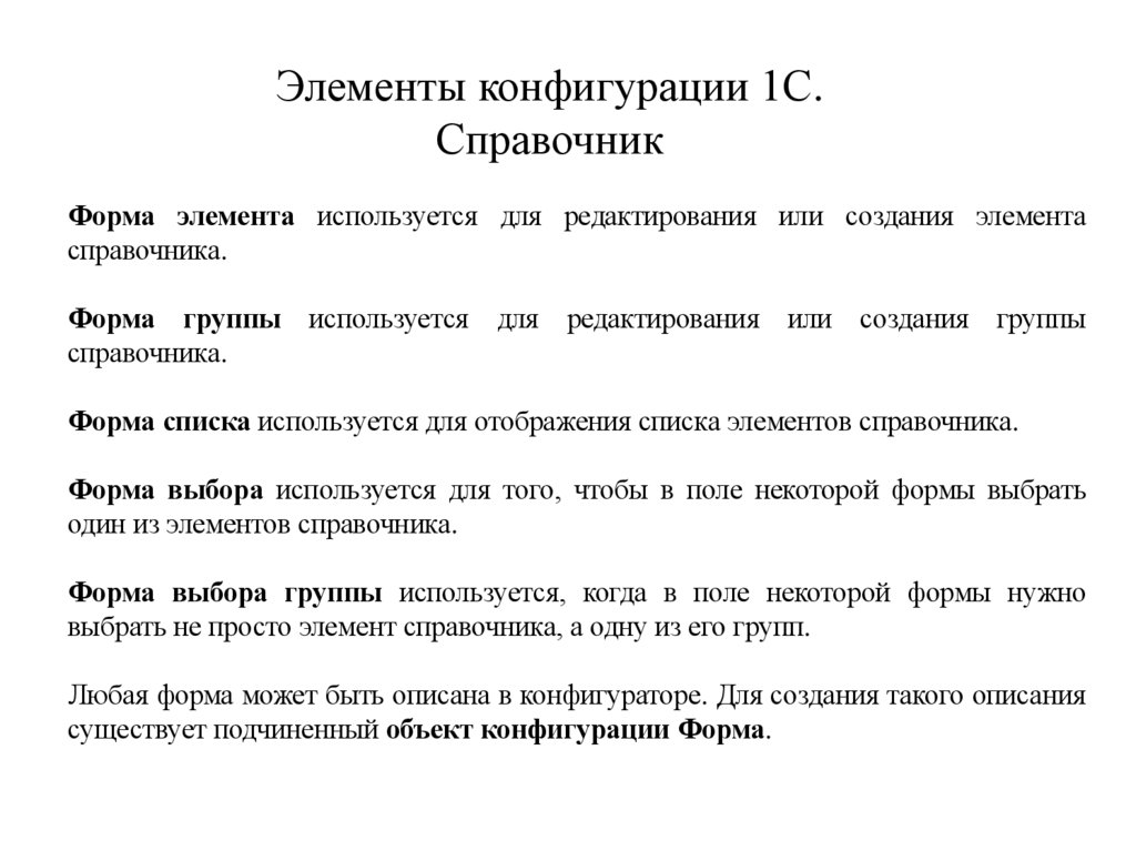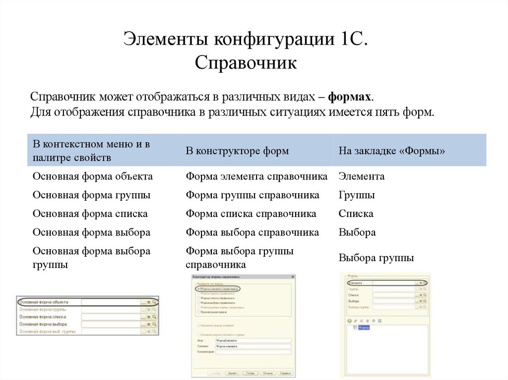 Для отображения справочника в различных ситуациях имеется пять форм.
