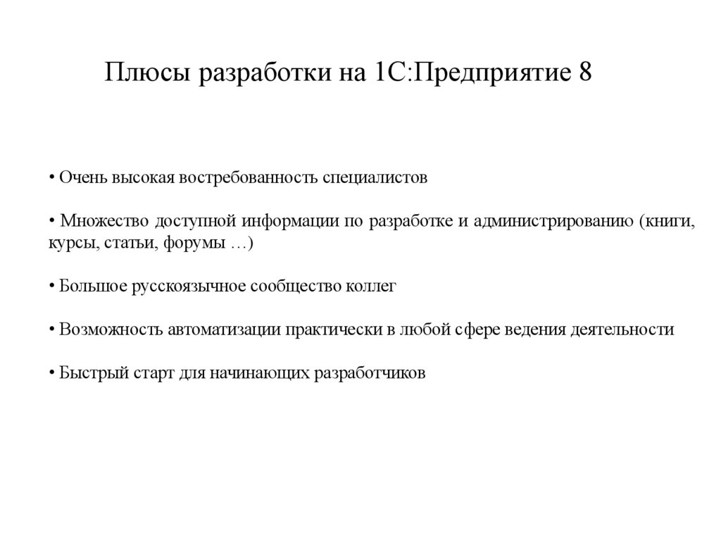 Плюсы разработки на 1С:Предприятие 8• Очень высокая востребованность специалистов