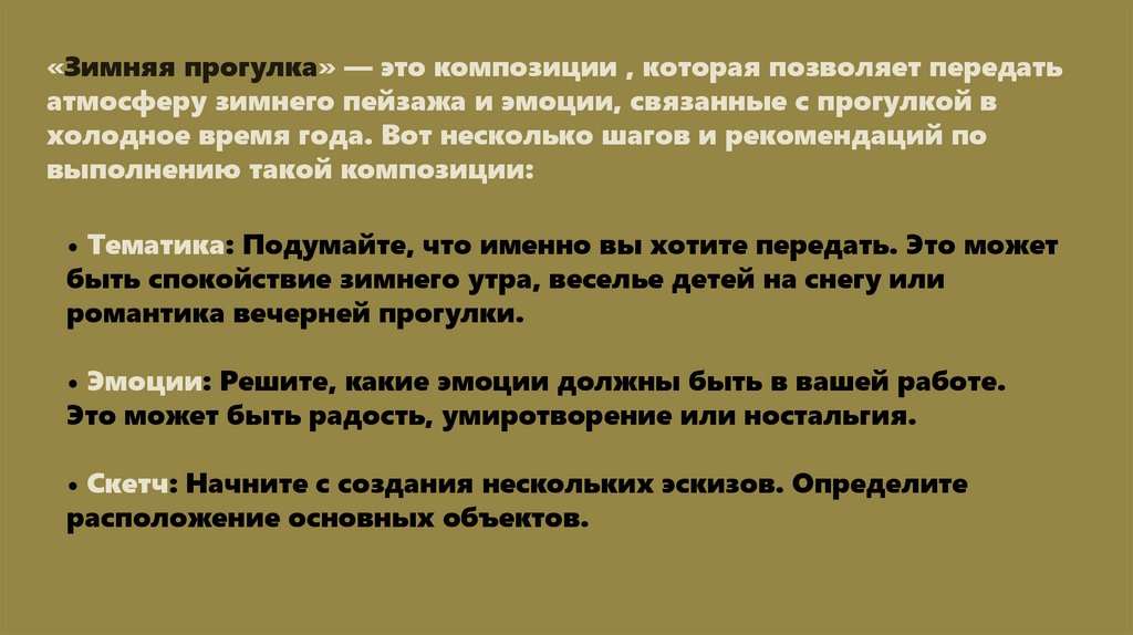 «Зимняя прогулка» — это композиции , которая позволяет передатьатмосферу зимнего пейзажа и эмоции, связанные с прогулкой в