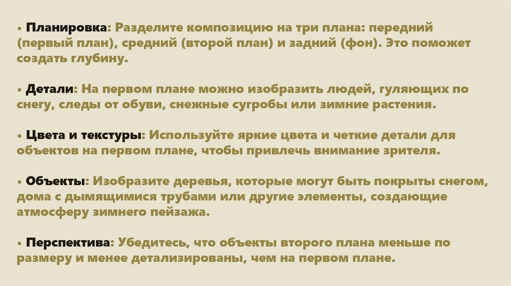 • Планировка: Разделите композицию на три плана: передний(первый план), средний (второй план) и задний (фон). Это поможет