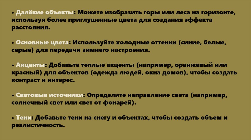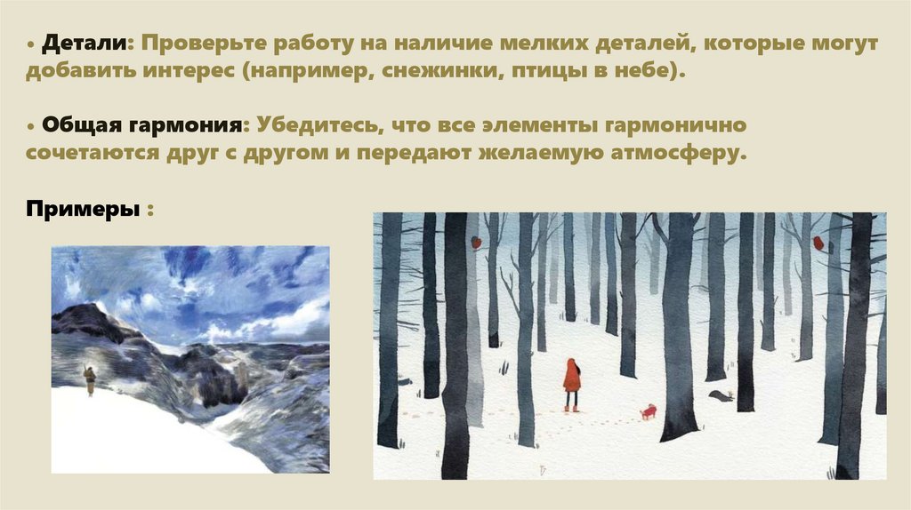 • Детали: Проверьте работу на наличие мелких деталей, которые могутдобавить интерес (например, снежинки, птицы в небе).
