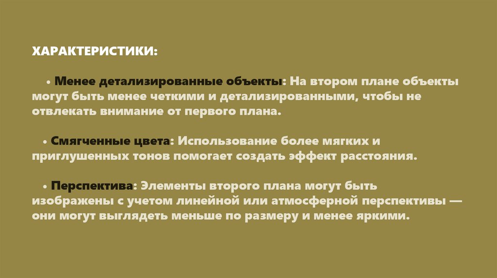 ХАРАКТЕРИСТИКИ:• Менее детализированные объекты: На втором плане объекты