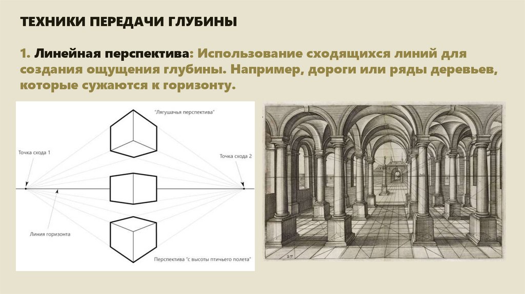 ТЕХНИКИ ПЕРЕДАЧИ ГЛУБИНЫ1. Линейная перспектива: Использование сходящихся линий для
