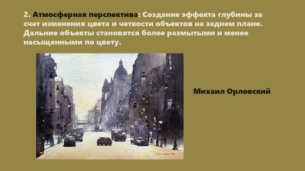 2. Атмосферная перспектива: Создание эффекта глубины засчет изменения цвета и четкости объектов на заднем плане.