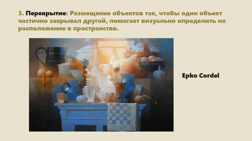 3. Перекрытие: Размещение объектов так, чтобы один объектчастично закрывал другой, помогает визуально определить их
