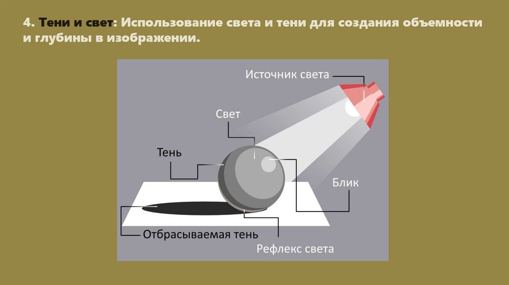 4. Тени и свет: Использование света и тени для создания объемностии глубины в изображении.