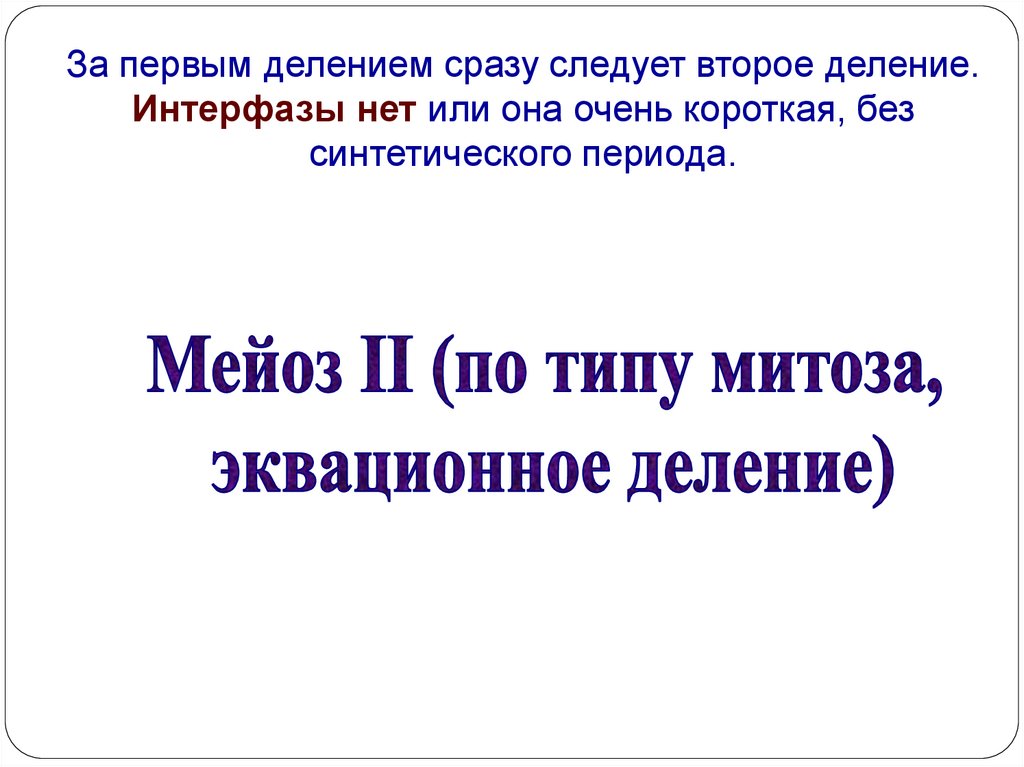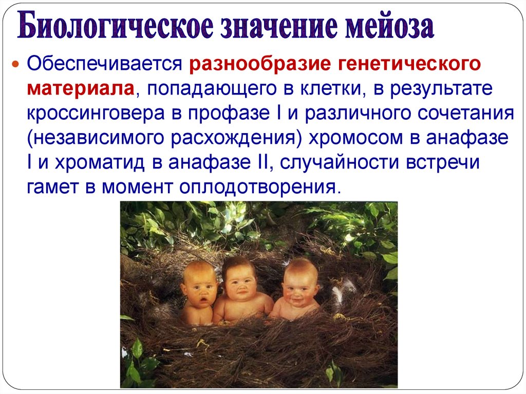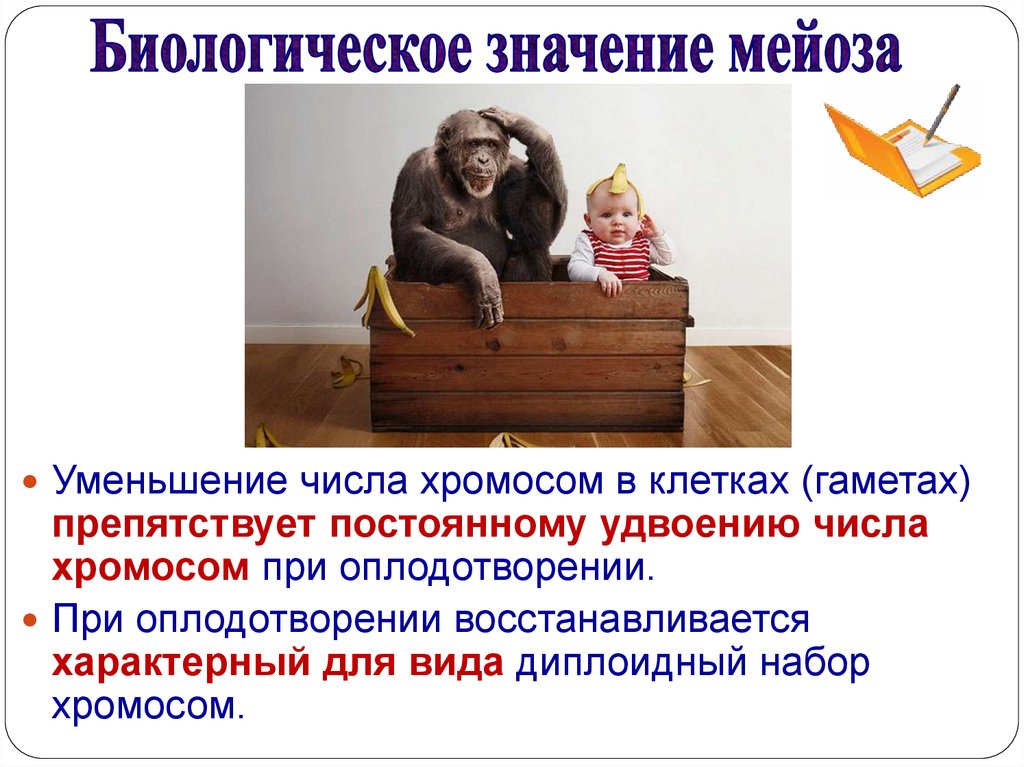 • Происходит поддержание числа хромосом из поколения в поколение.Зрелые гаметы получают гаплоидное число (n) хромосом, а при