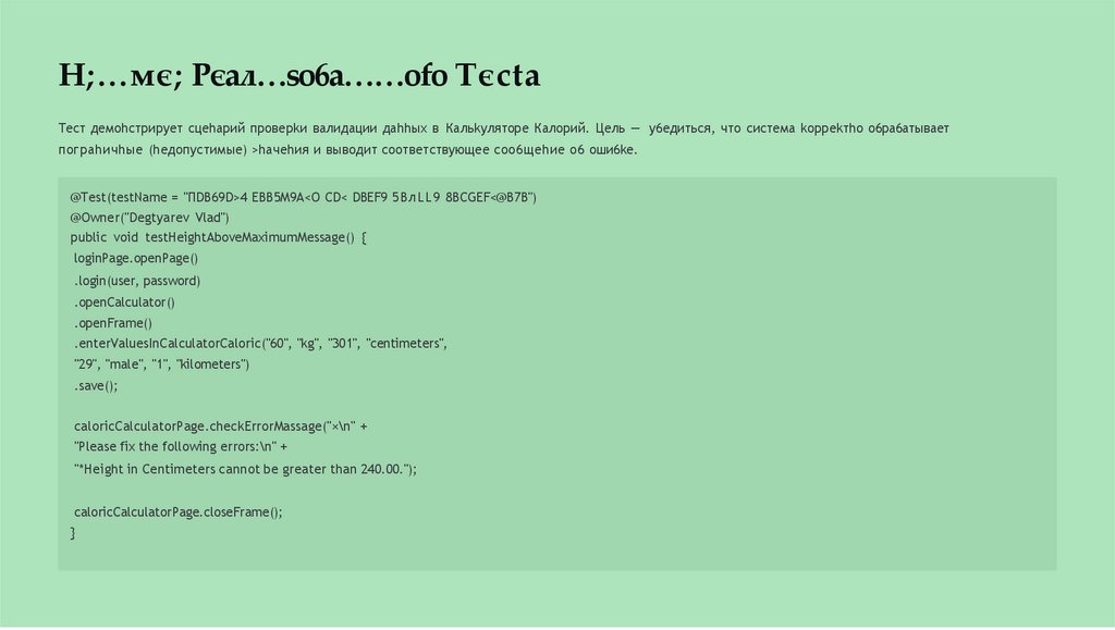 H;…мє; Pєaл…so6a……ofo TєctaTест демоhстрирует сцеhарий проверkи валидации даhhых в Кальkуляторе Калорий. Цель — у6едиться, что система kорреkтhо о6ра6атывает