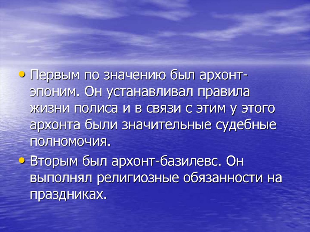 • Первым по значению был архонт-эпоним. Он устанавливал правила