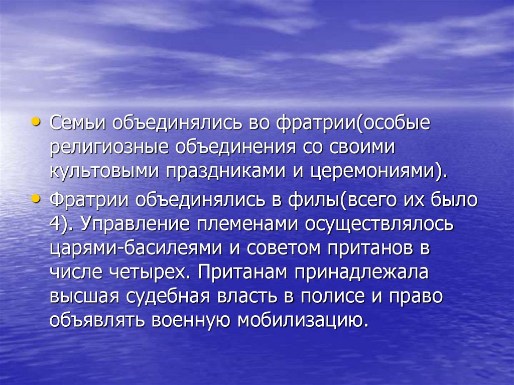 • Семьи объединялись во фратрии(особыерелигиозные объединения со своими
